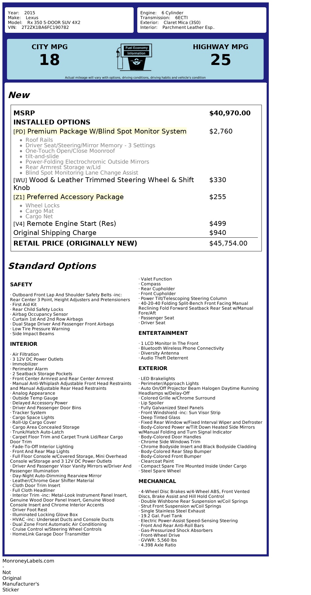 City 18/Hwy 25 Estimated By E.P.A. - Actual Mileage May Vary